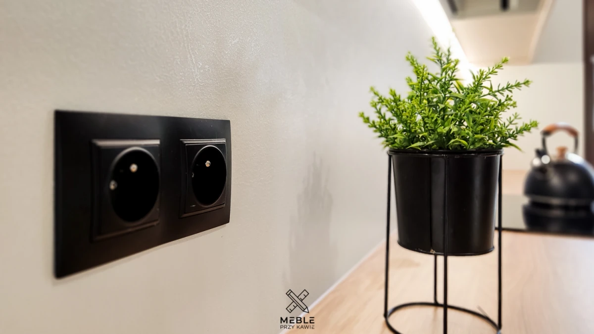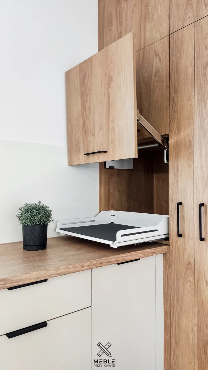 • Szufladka na ekspres do kawy – ukryta w samym rogu zabudowy, zapewnia wygodny dostęp do urządzenia i pozwala zachować porządek na blacie.