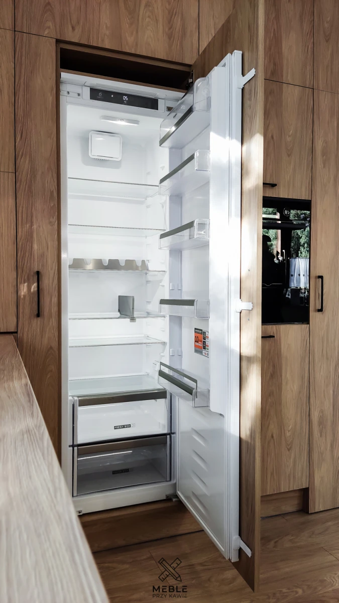 • Zabudowana chłodziarka – dyskretnie wkomponowana w całość, nie zakłóca estetyki kuchni.