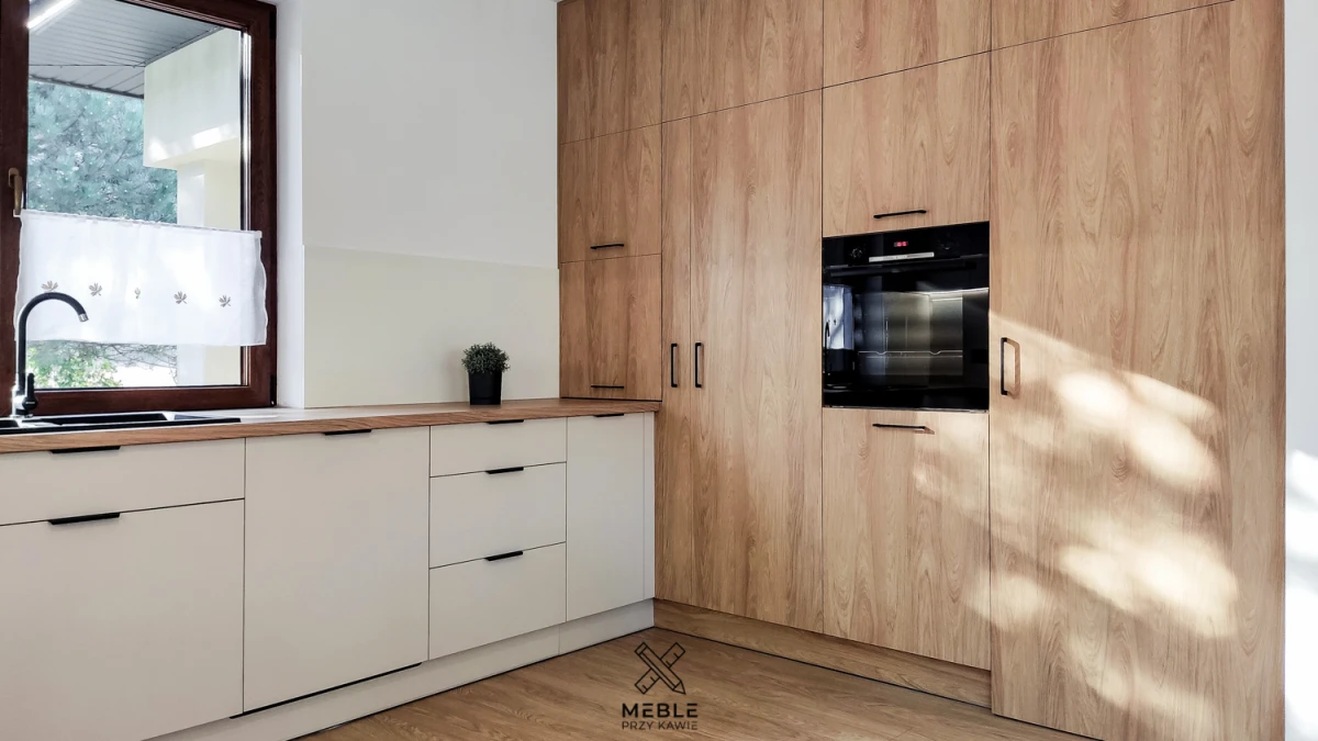 Subtelne odcienie beżu, naturalne drewno i przemyślana funkcjonalność – ta kuchnia to idealne połączenie estetyki i praktyczności. Zobacz przestrzeń, która zachwyca spokojem, a jednocześnie kryje nowoczesne rozwiązania ułatwiające codzienne gotowanie.