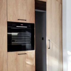 • Ukryta spiżarnia – wejście wkomponowane w drewniane fronty, pozostaje niezauważalne dla gości, a jednocześnie niezwykle praktyczne na co dzień.