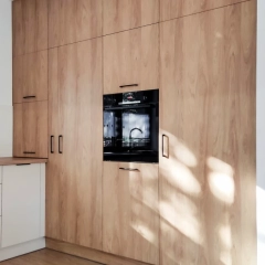 W tym wnętrzu królują jasne barwy, stonowane kontrasty oraz przemyślane rozwiązania. Dzięki nim codzienne gotowanie staje się jeszcze przyjemniejsze. Całość została wykonana z wysokiej jakości płyty laminowanej, co gwarantuje trwałość i łatwość w utrzymaniu czystości. Dominującym kolorem frontów jest Beż jasny z oferty Swiss Krono – jednolity, elegancki odcień, który nadaje wnętrzu lekkości i nowoczesnego charakteru. Uzupełnieniem dla niego jest Egger Hikora naturalna – płyta drewnopodobna, która wprowadza do kuchni ciepły, przytulny klimat. Dzięki temu połączeniu przestrzeń jest spokojna i ponadczasowa, nawiązująca do stylu skandynawskiego oraz współczesnego minimalizmu.