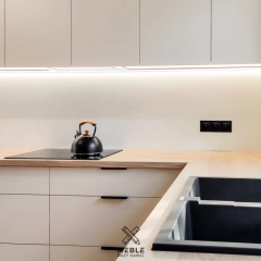 Ścianę nad blatem chroni i zdobi okładzina HPL w kolorze białym z delikatną strukturą 3D. To nie tylko praktyczne, ale i estetyczne rozwiązanie – gładka powierzchnia łatwo się czyści, a subtelna faktura dodaje głębi i urozmaica jednolitą kompozycję. Biały kolor okładziny idealnie wpisuje się w całość, nie dominując przestrzeni, lecz tworząc jej tło.