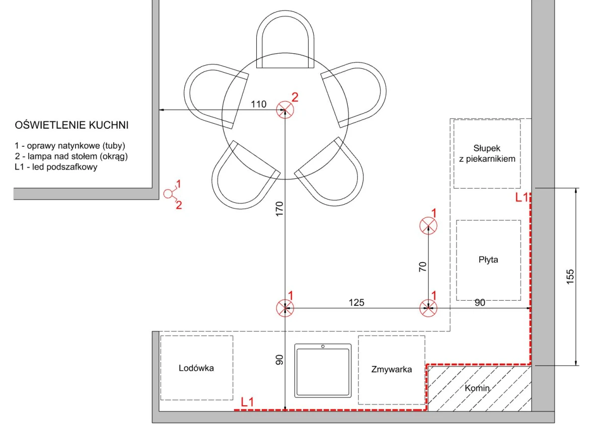 wielkość będzie miała kuchnia (większa kuchnia potrzebuje więcej punktów oświetlenia),