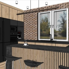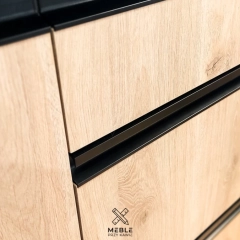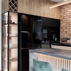 Kuchnia w stylu loftowym charakteryzyje się między innymi funkcjonalnością, dlatego na blat i okładzinę ścienną wybraliśmy laminat Rabac z firmy Pfleiderer. Nieregularne cieniowanie tego dekoru sprawia, że pomimo ciemnej barwy, blat będzie łatwy w utrzymaniu czystości. Fronty i korpusy szafek wykonaliśmy z płyty laminowanej Swiss Krono Dąb naturalny, która ociepla całe pomieszczenie. W loftowej aranżacji nie może zabraknąć metalu – tutaj występuje w postaci spawanych półek nad półwyspem oraz jako ramki frontów witryny. Uchwyty również są metalowe. Inwestorom zależało aby były zlicowane z frontami. W tym przypadku zastosowaliśmy czarny profil nabijany. W loftowej aranżacji nie może zabraknąć lameli, które są idealne jako dekoracja półwyspu. Listwa ledowa zamontowana pod blatem dodatkowo podkreśla ich ozdobny charakter. Elementem przykuwającym wzrok jest niewątpliwie ściana frontowa, wykończona ceglanymi licami w stonowanych odcieniach czerwieni, brązu i pomarańczu. Całość dopełnia zróżnicowane oświetlenie, podzielone na strefy w zależności od pełnionej funkcji.