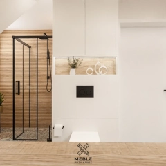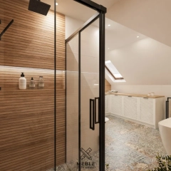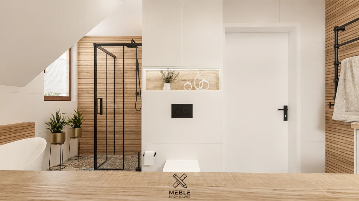 W prezentowanej łazience udało się połączyć oba rozwiązania – zarówno wolnostojącą wannę, jak i nowoczesną kabinę prysznicową. Wanna została umieszczona w przestrzeni, gdzie skos dachu nie ogranicza użytkowania, co pozwala na swobodne korzystanie z kąpieli. Natomiast na kabinę prysznicową z czarnymi, minimalistycznymi ramami i deszczownicą znalazło się miejsce przy kominie.