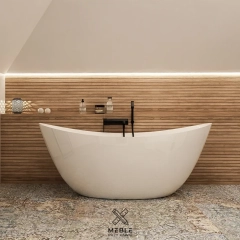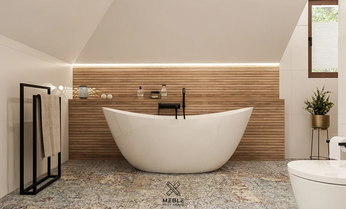 Wolnostojąca wanna w tej aranżacji to prawdziwa ozdoba wnętrza. Umieszczona w centralnym punkcie łazienki na tle z imitującymi drewno płytkami, tworzy atmosferę spa i idealne miejsce do relaksu po długim dniu. Czarne baterie w minimalistycznym stylu doskonale kontrastują z bielą wanny, nadając całości nowoczesnego charakteru. Dodatkowym atutem jest subtelne oświetlenie LED nad wanną, które podkreśla przytulny i luksusowy klimat pomieszczenia.