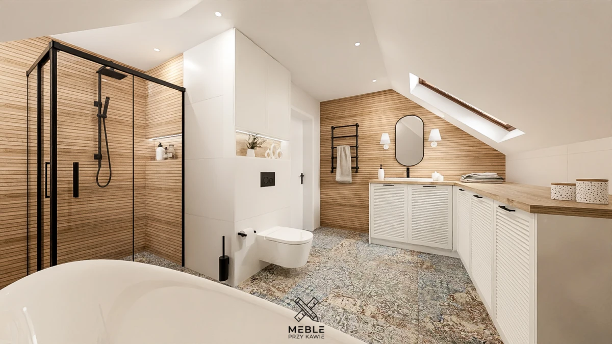 Wnętrze łazienki łączy w sobie ciepło drewna i elegancję nowoczesnego designu. Ściany zostały wyłożone płytkami imitującymi drewno, które nadają wnętrzu przytulności. Czarne akcenty, takie jak rama prysznica, armatura i grzejnik, podkreślają nowoczesny styl i dodają pomieszczeniu kontrastu. Na podłodze zastosowano płytki o patchworkowym wzorze, które sprawiają wrażenie dywanu. Ich delikatnie przetarte wzory i bogata kolorystyka nadają łazience unikalny wygląd, przypominający wnętrza inspirowane stylem vintage czy boho. To doskonałe rozwiązanie dla osób, które chcą dodać do łazienki odrobinę artystycznego wyrazu oraz dodatkowo ocieplić wnętrze domowego spa.