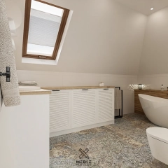 Pod skosem znalazła się zabudowa meblowa, która nie tylko harmonizuje z wystrojem łazienki, ale także kryje w sobie pralkę i suszarkę slim. Dzięki temu urządzenia AGD nie zaburzają estetyki wnętrza, a jednocześnie pozostają łatwo dostępne. Żaluzjowe fronty meblowe dodają zabudowie lekkości oraz zapewniają odpowiednią wentylację, a drewniany blat laminowany w dekorze dębu naturalnego jest łatwym w utrzymaniu zwieńczeniem zabudowy. Takie rozwiązanie to idealny sposób na wykorzystanie trudnej przestrzeni pod skosem i zachowanie spójnej stylistyki wnętrza.