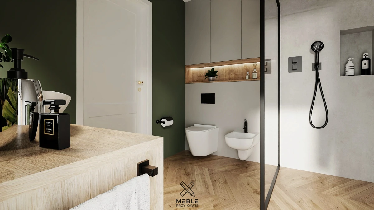 Prysznic typu walk-in to wygodne i estetyczne rozwiązanie – brak brodzika oraz zastosowanie szklanej tafli sprawiają, że przestrzeń wygląda na bardziej otwartą i przestronną. Zintegrowana deszczownica i słuchawka prysznicowa w czarnym, matowym wykończeniu podkreślają nowoczesny charakter wnętrza. Wnęka w ścianie prysznica to nie tylko element dekoracyjny, ale przede wszystkim praktyczne miejsce na przechowywanie kosmetyków – dzięki niej unikamy konieczności montażu dodatkowych półek.