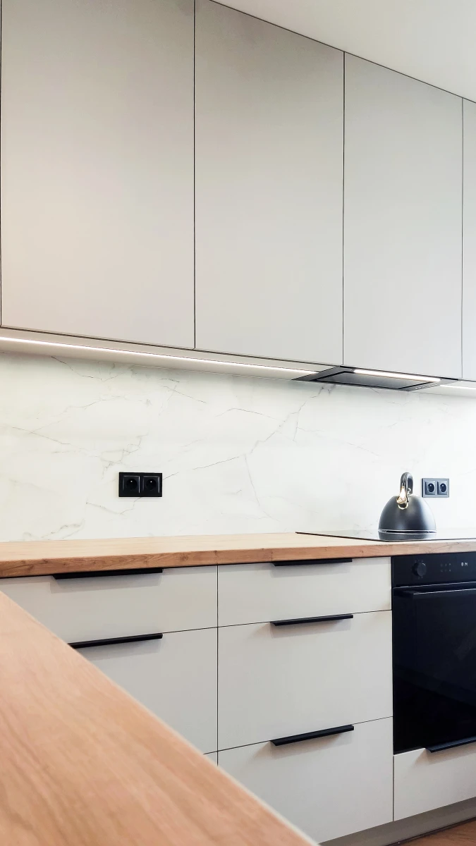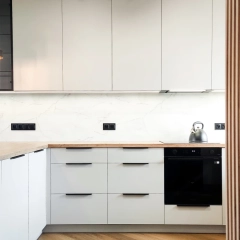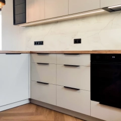 W tej realizacji bazą są gładkie matowe fronty lakierowane w bardzo jasnym odcieniu szarości. Jasną, stonowaną kolorystykę frontów przełamano blatem laminowanym w dekorze Dębu Odwiecznego, który ociepla całość i przełamuje chłodniejszą bazę kolorystyczną. To sprawdzone zestawienie, często wykorzystywane w nowoczesnych realizacjach - jasnoszare fronty i dekor drewna dobrze się uzupełniają. Na ścianie roboczej zastosowano okładzinę HPL ze wzorem marmuru - rozwiązanie praktyczne, a jednocześnie wizualnie lekkie, dobrze komponujące się z jasną zabudową.