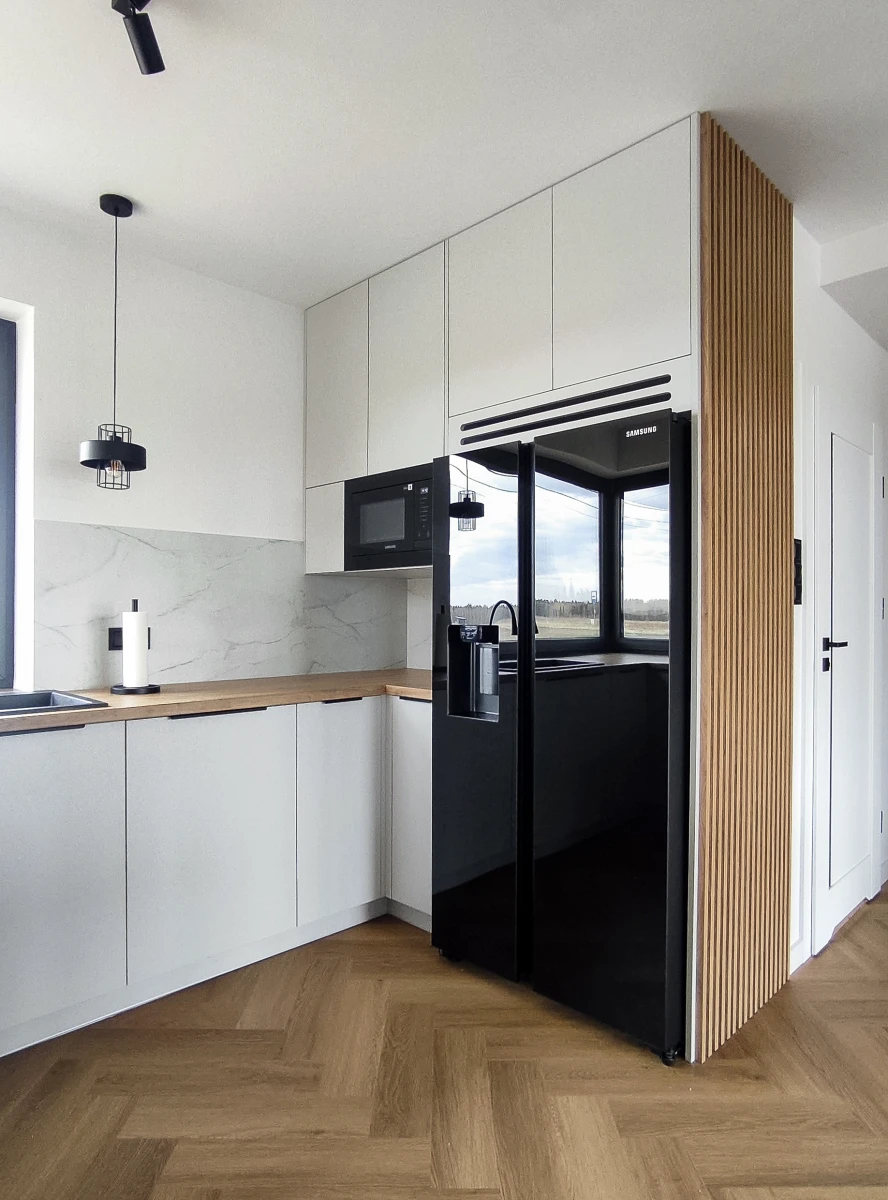 O charakterze tej kuchni decydują detale, które nie są przypadkowe, lecz konsekwentnie prowadzą stylistykę całej zabudowy. Tył wyspy wykończono jasnoszarym panelem frezowanym we wzór lamelowy, który dodaje głębi i przełamuje gładkie powierzchnie mebli. Czarne, krawędziowe uchwyty podkreślają podziały frontów i wprowadzają graficzny akcent, spójny z pozostałymi czarnymi elementami we wnętrzu.