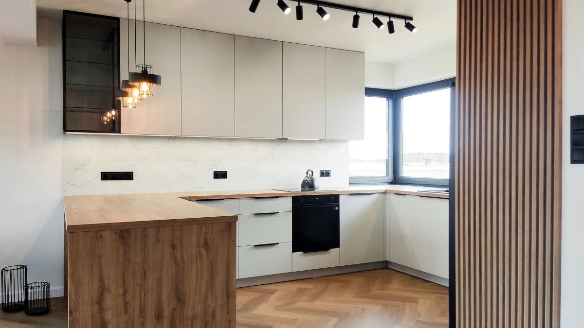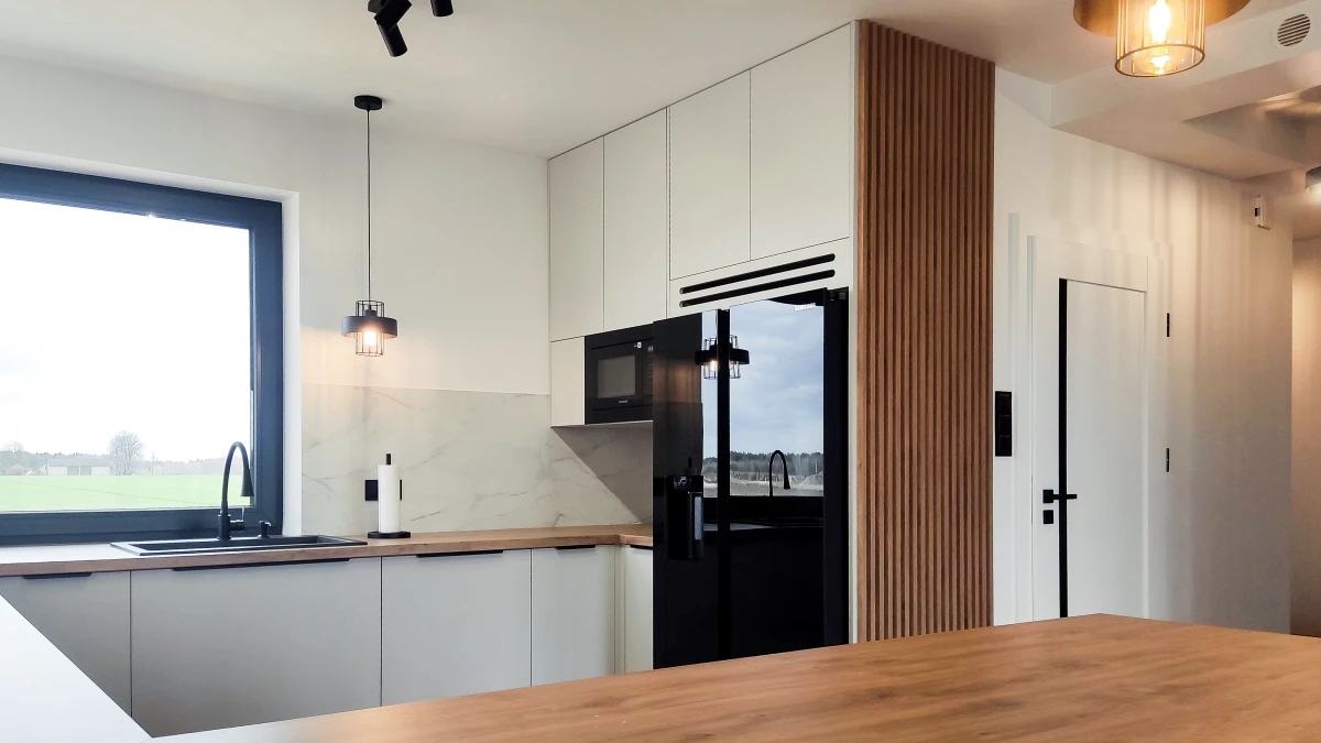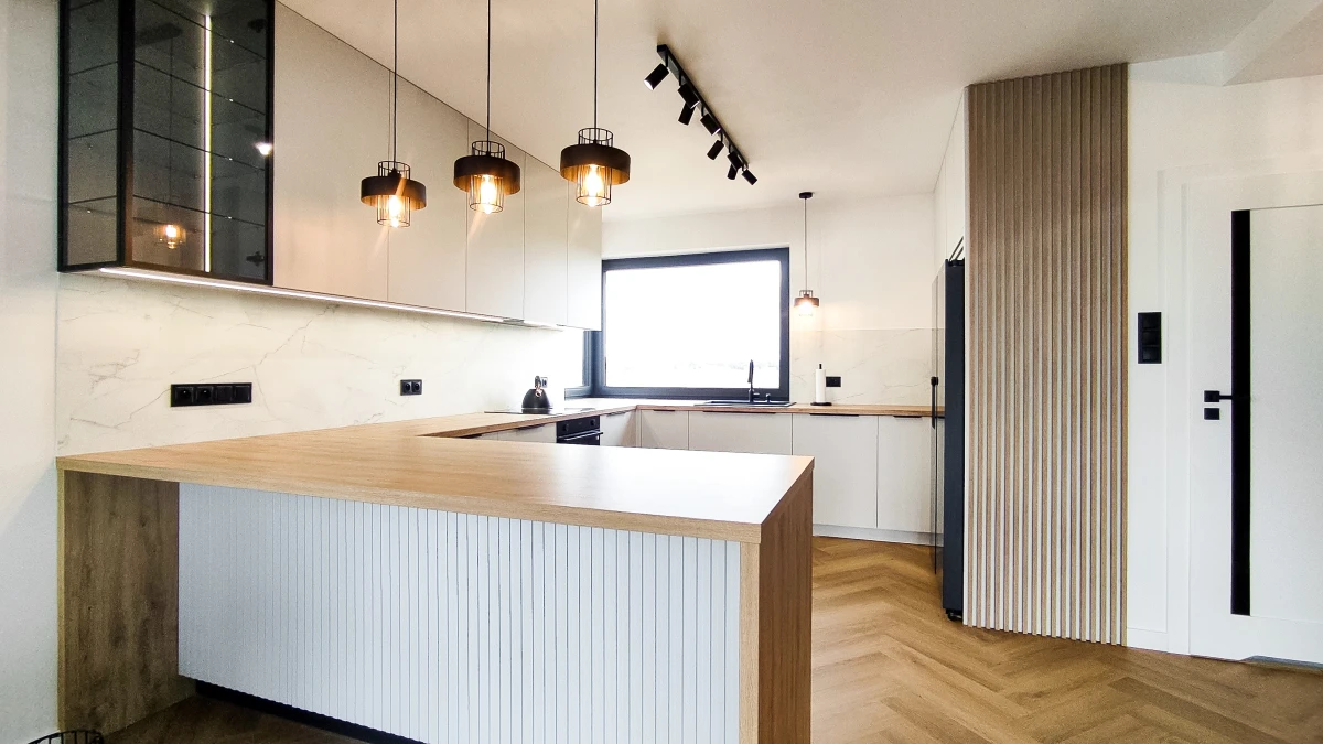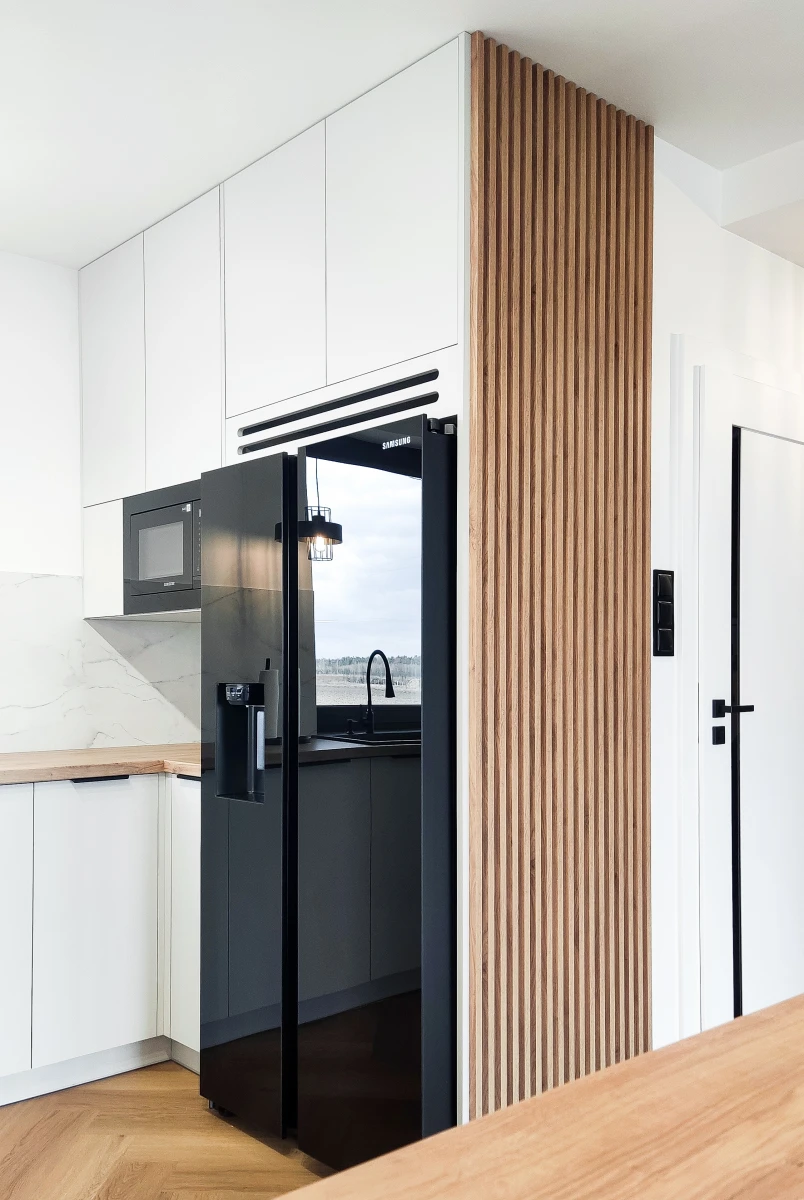 Ważnym elementem jest również witryna nad półwyspem, która subtelnie domyka kuchnię od strony strefy dziennej. Czarne ramki aluminiowe i grafitowe szkło nadają jej elegancki, nieco bardziej wyrafinowany charakter, a szklane półki wewnątrz podkreślają lekkość tej formy. Z prawej strony całość dopełnia motyw drewnianych lameli wykonanych z płyty laminowanej, który pojawia się jako wyraźny akcent dekoracyjny. Liniowa struktura wprowadza rytm, głębię i naturalność, przełamując gładkie powierzchnie i wzmacniając indywidualny charakter tej realizacji.