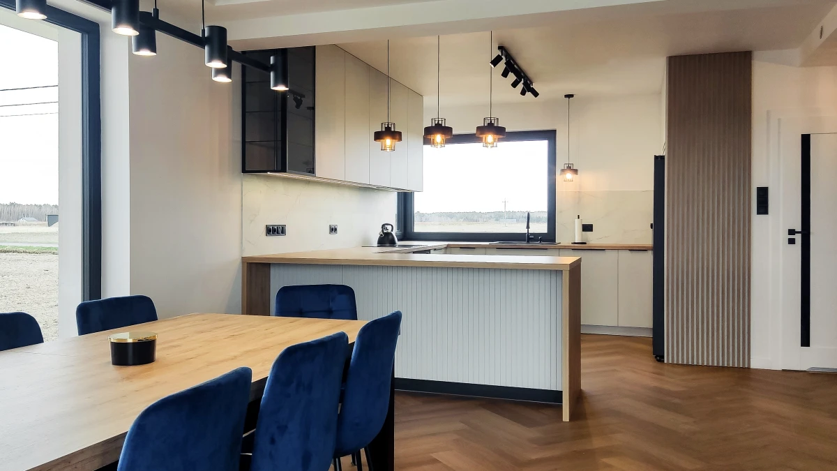 Oświetlenie zaplanowano w kilku niezależnych strefach, tak aby łączyło funkcję użytkową z budowaniem nastroju wnętrza. Podstawowe światło zapewnia czarna szyna z regulowanymi reflektorami, które pozwalają precyzyjnie doświetlić wybrane obszary kuchni. Nad wyspą oraz w strefie zlewozmywaka zastosowano lampy wiszące - wyraziste w formie, ale dobrze zbalansowane wizualnie, dzięki czemu stanowią mocny, lecz nienachalny akcent dekoracyjny. Komfort pracy przy blacie podnoszą taśmy LED ukryte pod szafkami górnymi. Całość uzupełnia pionowe oświetlenie LED w witrynie, które subtelnie podkreśla jej formę i dodaje wnętrzu głębi po zmroku.