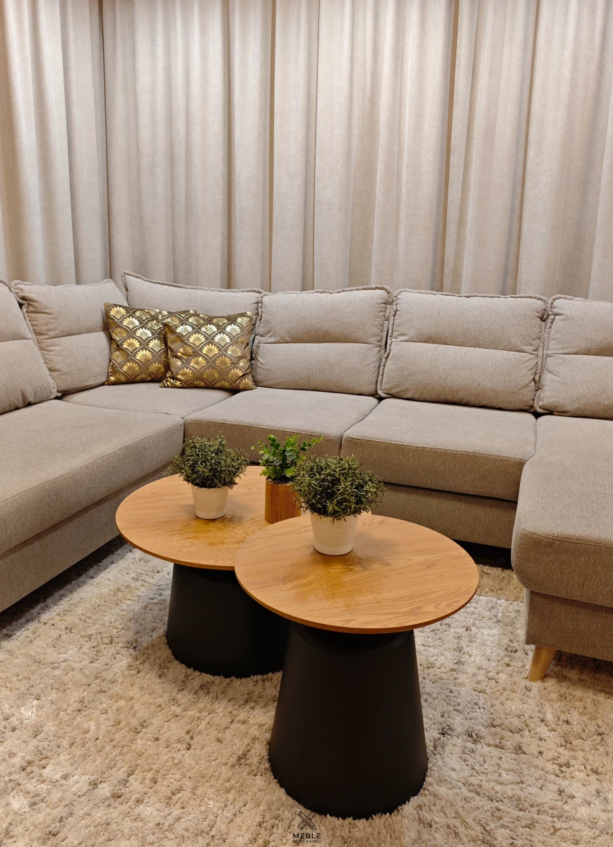 Strefa wypoczynkowa została oparta na narożniku w kształcie litery U, który umożliwia wygodne korzystanie z salonu większej liczbie osób jednocześnie. Zamiast jednego dużego stolika kawowego zastosowano dwa mniejsze. Takie rozwiązanie daje większą elastyczność aranżacyjną i lepiej odpowiada na potrzeby użytkowników siedzących w różnych częściach narożnika. Zastosowanie miękkich tkanin, dywanu oraz tapicerowanych mebli pozwoliło nadać wnętrzu przytulny charakter, mimo dużej otwartej przestrzeni.