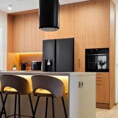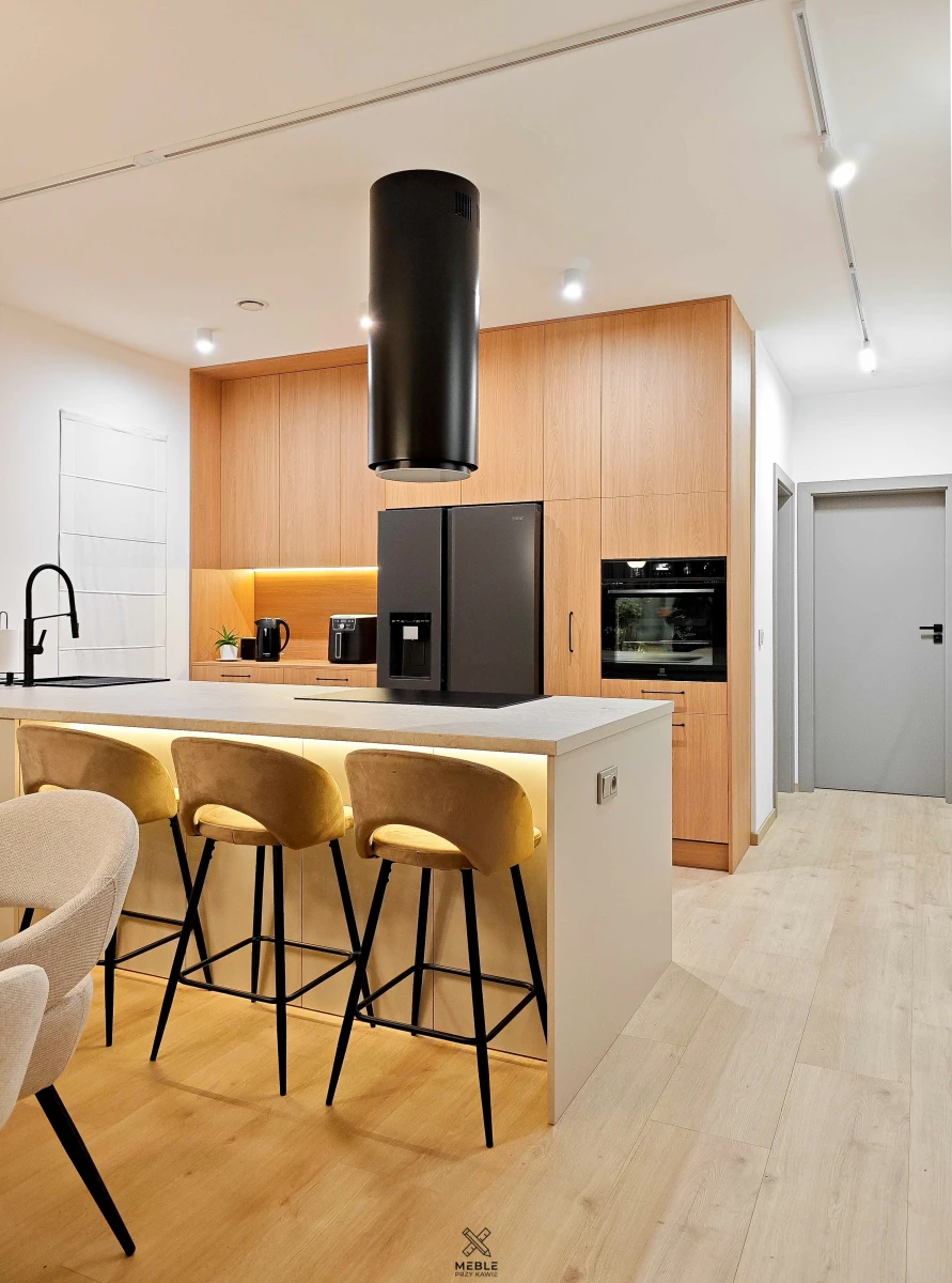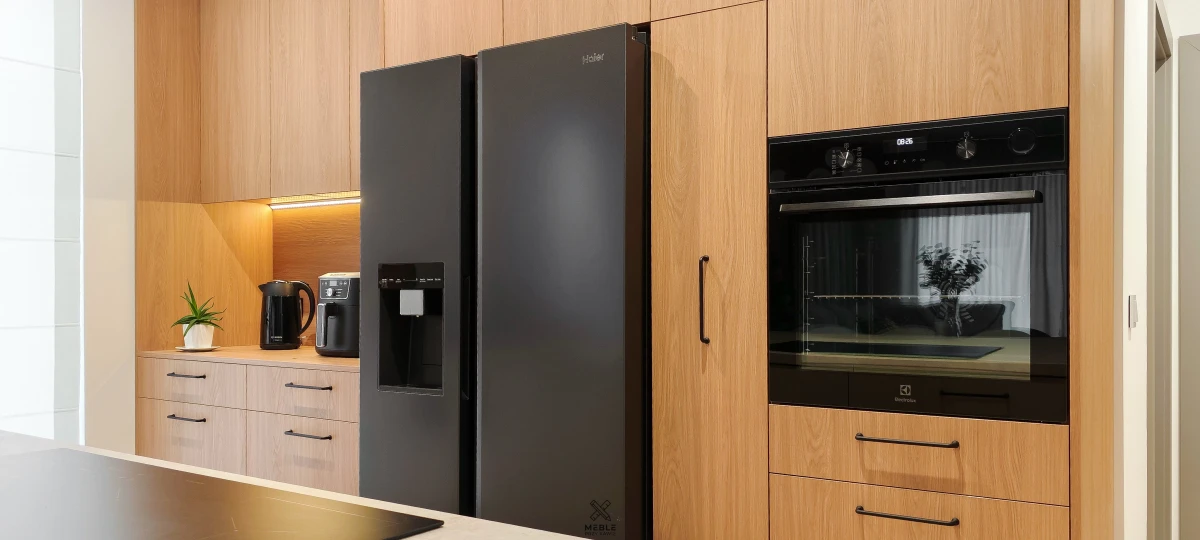 Przy zabudowie zaplanowano dodatkowy blat przeznaczony na małe sprzęty nablatowe, takie jak czajnik czy airfryer. Zarówno blat, jak i wnęka wykończone zostały tym samym dekorem drewnianym, co pozwala uniknąć wyróżniania tej strefy i nie wprowadza dodatkowych podziałów wizualnych. Dzięki temu zabudowa odbierana jest jako jednolita, spokojna bryła, a główna część robocza kuchni pozostaje uporządkowana, co ma szczególne znaczenie w układzie otwartym na salon.