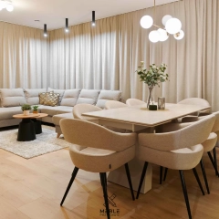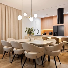 Dzięki odpowiedniej skali mebli jadalnia nie „ginie” w przestrzeni i zachowuje właściwe proporcje względem kuchni i salonu. Dzięki tekstyliom i tapicerowanym formom jadalnia oferuje komfort porównywalny ze strefą wypoczynkową, zachęcając do spędzania w niej czasu nie tylko przy posiłkach.
