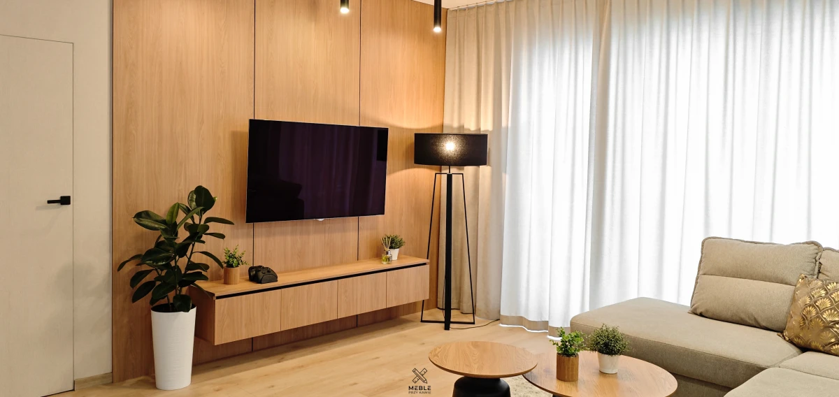 Tłem strefy medialnej są panele z płyty laminowanej w tym samym dekorze, co wysoka zabudowa kuchenna, co pozwala zachować kolorystyczną równowagę w całej strefie dziennej. Powtórzenie materiału w różnych częściach wnętrza porządkuje przestrzeń i sprawia, że kuchnia oraz salon odbierane są jako jedna, spójna całość, a nie zbiór niezależnych elementów.