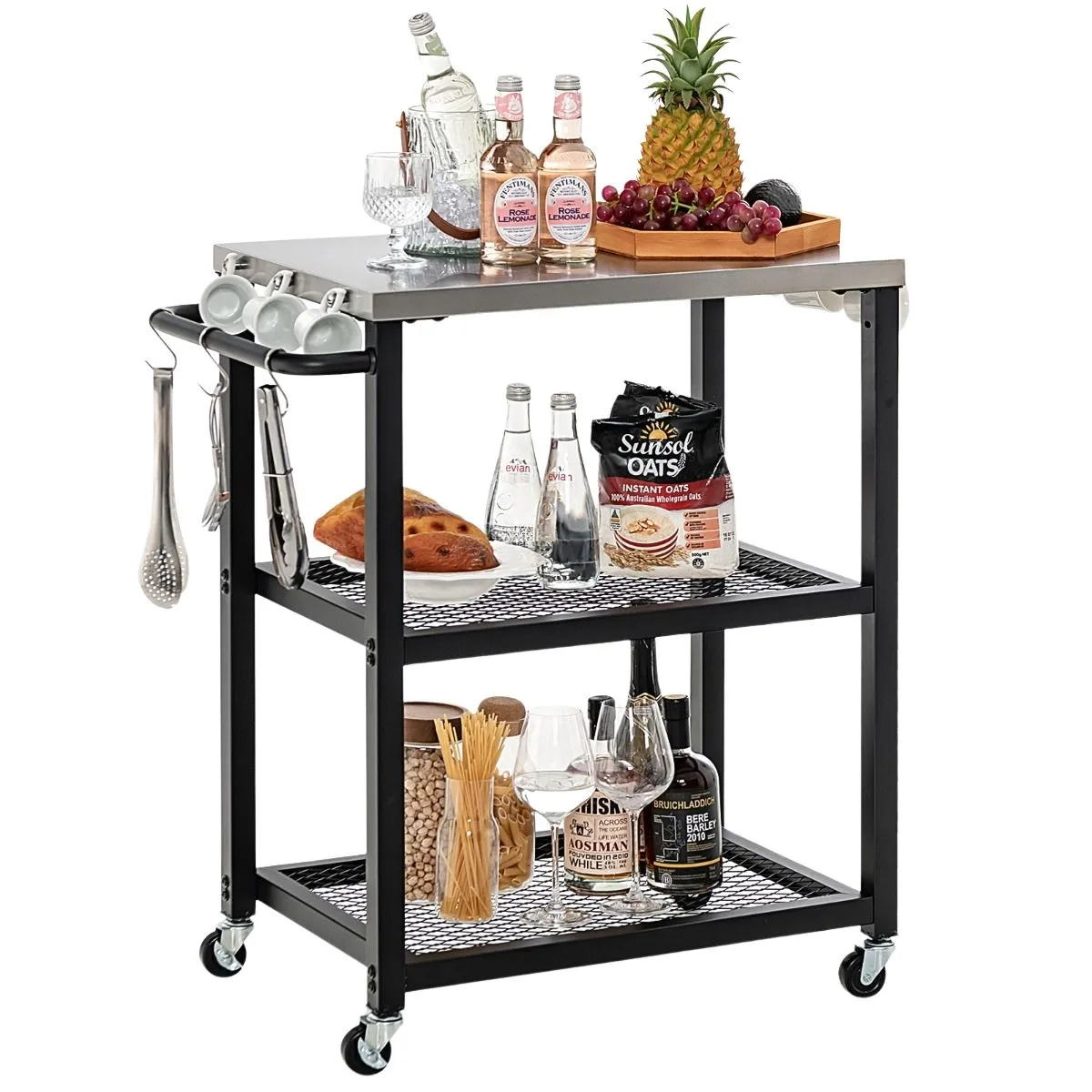 Niezwykle praktyczny i solidny wózek do serwowania, który łączy w sobie funkcjonalność z trwałością. Idealny do codziennego użytku w kuchni, ogrodzie czy na tarasie. Dzięki dużej powierzchni blatu, dodatkowym półkom oraz uchwytom i haczykom, możesz łatwo przechowywać wszystkie niezbędne przybory kuchenne. Mobilność zapewniają obrotowe kółka z blokadą, które ułatwiają przemieszczanie wózka. Natomiast solidna konstrukcja ze stali nierdzewnej oraz metalu gwarantuje trwałość i stabilność mebla. Zamów wózek już dziś i ciesz się wygodą i organizacją w swoim otoczeniu!   Wytrzymały blat ze stali nierdzewnej: Ten wózek do grilla jest wykonany z wytrzymałego blatu ze stali nierdzewnej i jest zbudowany tak, aby wytrzymać upływ czasu. Jego gładka i wodoodporna powierzchnia sprawia, że czyszczenie nie wymaga wysiłku, a Ty nie musisz się martwić, że wózek wyblaknie lub zardzewieje. Dużo miejsca do przechowywania: Dzięki dużemu blatowi roboczemu wózek oferuje miejsce na różne sprzęty oraz składniki spożywcze, dzięki czemu idealnie nadaje się do przygotowywania posiłków. Wózek posiada 2 dodatkowe półki pod blatem, a także 3 zakładane haczyki i 6 uchwytów do zawieszania niezbędnych naczyń czy narzędzi. Kółka z blokadą: Stół do grillowania został zaprojektowany z myślą o łatwej obsłudze i jest wyposażony w cztery płynnie obracające się kółka oraz boczny uchwyt, dzięki czemu można go bez wysiłku przesuwać. Dla zwiększenia bezpieczeństwa, dwa z kół posiadają blokadę, dzięki której wózek pozostaje na wyznaczonym miejscu. Wszechstronny wózek do użytku na zewnątrz: To nie tylko zwykły wózek do grillowania, ale także stolik na kwiaty, przydatny stół warsztatowy lub stojak na kuchenkę mikrofalową lub piekarnik, który możesz umieścić w swojej kuchni. Możliwość dostosowania naszego trzypoziomowego wózka sprawia, że jest on cennym dodatkiem do każdej przestrzeni na zewnątrz, jak i wewnątrz Twojego domu. Montaż jest dziecinnie prosty: Dzięki szczegółowym instrukcjom i wszystkim niezbędnym akcesoriom możesz złożyć wielofunkcyjny wózek bez wysiłku i w mgnieniu oka.