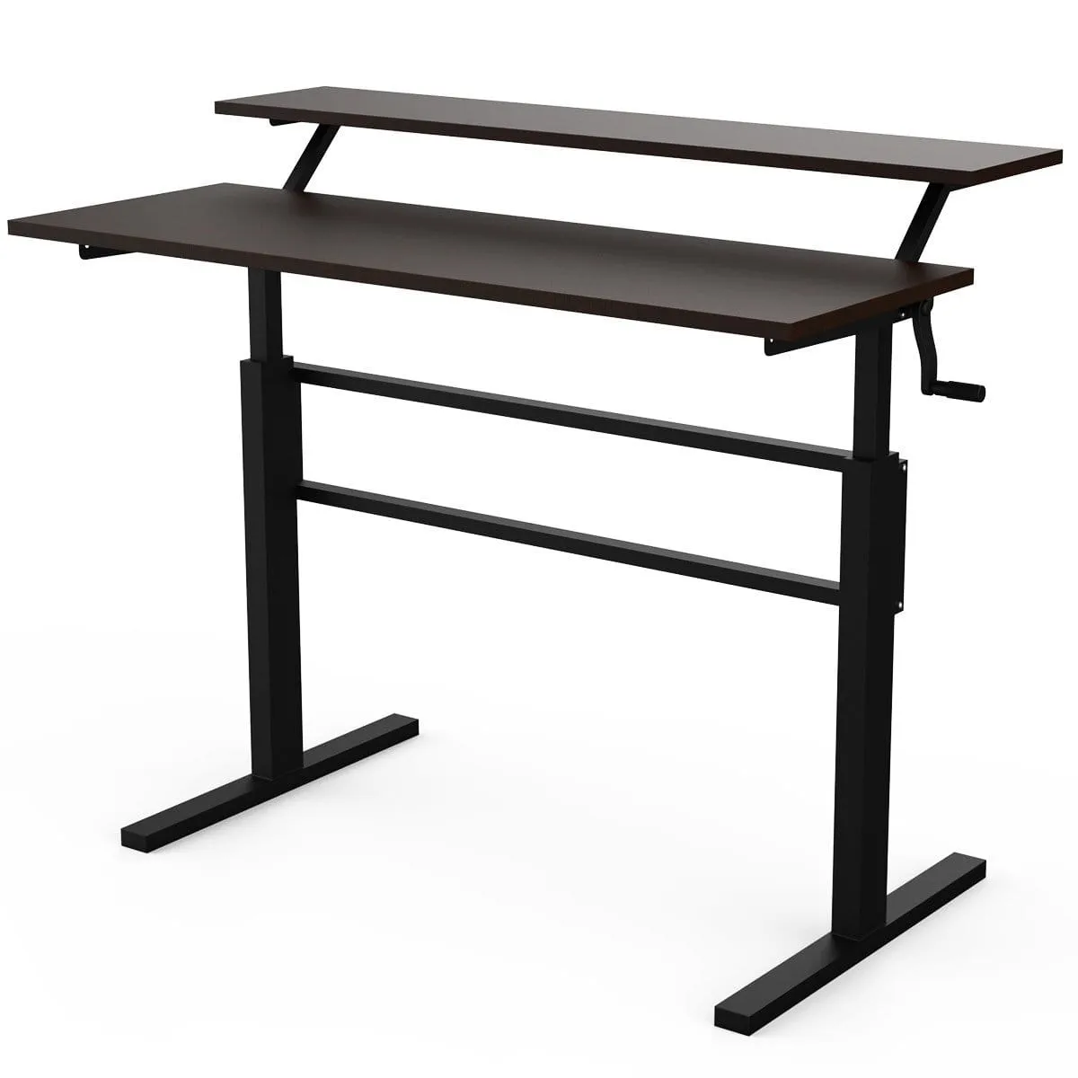 Biurko z regulacją wysokości i półką na monitor Regulowana wysokość:  składane biurko typu sit-stand, które można zamontować po prawej lub lewej stronie. Obróć korbę, aby bez hałasu wyregulować wysokość biurka w zakresie od 75 do 113 cm. Przestronna powierzchnia z półką na monitor: dzięki podniesionej półce na biurku jest dużo miejsca na ustawienie komputera i monitora oraz utrzymywanie ich na wysokości wzroku. W ten sposób masz więcej miejsca na klawiaturę, mysz, książki oraz inne artykuły biurowe. Doskonała jakość i wykonanie:  wykonane z płyty MDF i o konstrukcji stalowej biurko jest odporne, antykorozyjne i wytrzymałe. Powierzchnia została pokryta farbą elektrostatyczną, jest gładka i łatwa do czyszczenia. 2 poziome belki podtrzymują konstrukcję, gwarantują stabilność i wytrzymują duże obciążenia. Regulowane antypoślizgowe podkładki utrzymują stabilność biurka nawet na nierównych podłogach. Wygodne i wszechstronne: regulowana wysokość pozwala na zmianę pozycji do siedzącej lub stojącej. Dzięki temu ochronisz plecy, wspomożesz przepływ krwi, zmniejszysz bóle karku i pleców, zwiększysz koncentrację i poprawisz wydajność pracy. Nowoczesny i modny styl: dzięki minimalistycznemu wyglądowi i nowoczesnemu stylowi biurko pasuje do wszystkich przestrzeni biurowych. Może być używane jako biurko komputerowe, stół do nauki lub do grania w gry wideo. Idealnie nadaje się do gabinetu, sypialni, biura itp. Paczka zawiera: 1x biurko siedząco-stojące 1x korba 1x instrukcje