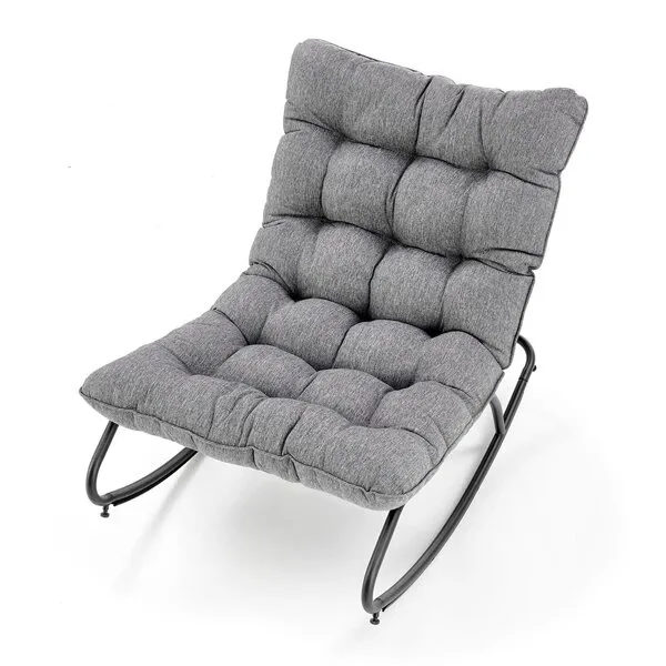 Fotel ogrodowy Gatto w kolorze popielatym z czarną podstawą łączy styl z funkcjonalnością. Wykonany z miękkiej tkaniny i trwałej stali, oferuje komfort bujania. Idealny do użytku wewnątrz i na zewnątrz, łatwy w czyszczeniu.