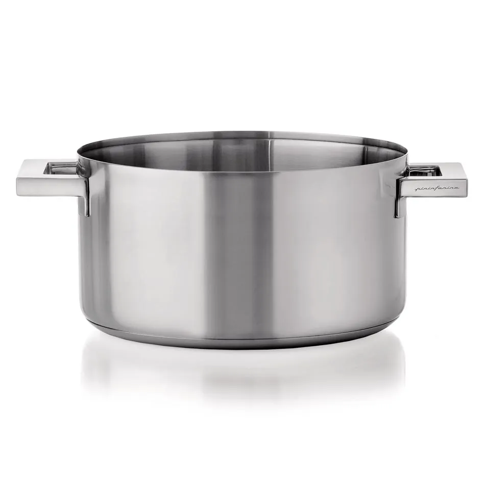 Garnek wykonany jest ze szczotkowanej stali nierdzewnej na zewnątrz oraz polerowanej wewnątrz. Wykończone na połysk są także kanciaste uchwyty (puste wewnątrz), które kontrastują z zaokrągloną formą naczynia.