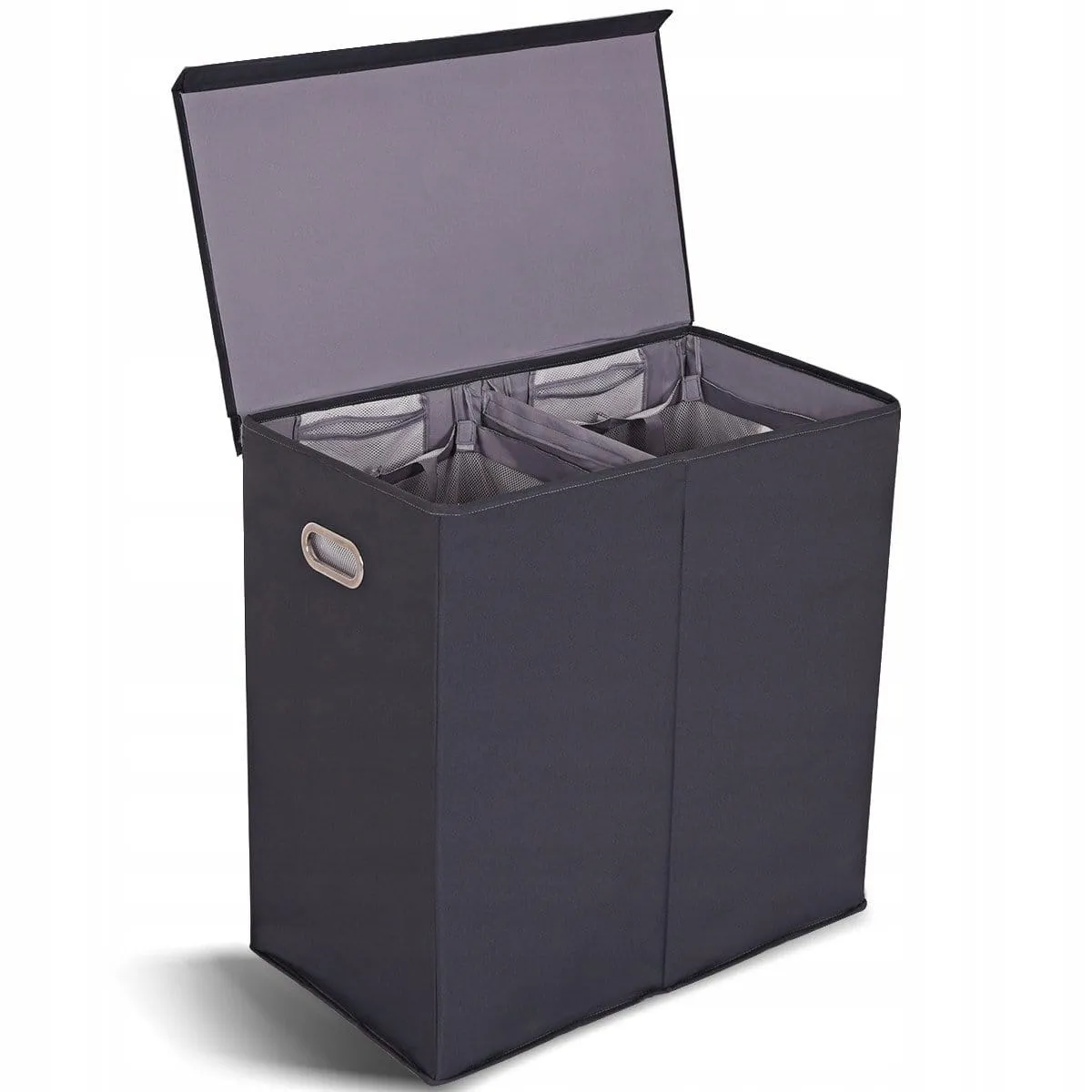 2-komorowy kosz na pranie z pokrywą Stylowe rozwiązanie do sortowania ubrań idealne do Twojego domu! 2 oddzielne komory - kosz na pranie składa się z 2 oddzielnych komór, dzięki czemu znacząco ułatwia sortowanie ubrań. W każdej komorze znajduje się dodatkowy wyjmowany worek na pranie Zdejmowana pokrywa - do kosza dołączona została zdejmowana pokrywa, która chroni ubrania oraz zapobiega uwalnianiu się zapachów Uchwyty do przenoszenia - kosz na bieliznę posiada dwa boczne uchwyty, które ułatwiają przenoszenie i gwarantują wygodę w codziennym użytkowaniu Składana konstrukcja - dzięki składanej konstrukcji kosz można z łatwością przechowywać i przenosić Wysokiej jakości materiały - kosz został wykonany z najwyższej jakości płyty MDF oraz poliestru, dzięki czemu zapewnia niezrównaną wytrzymałość i trwałość