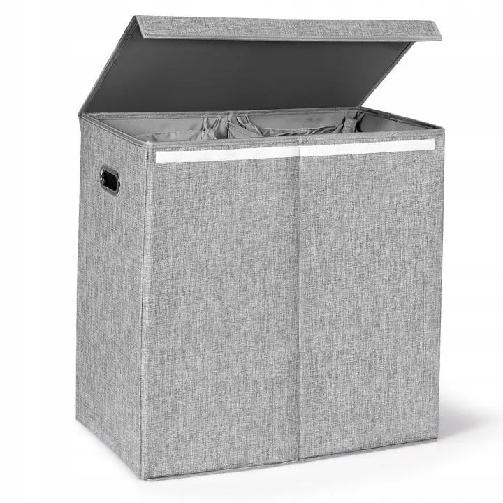 2-komorowy kosz na pranie 2 komory - 2 oddzielne komory z wyjmowanymi nylonowymi workami umożliwiają bieżące sortowanie ubrań. Pokrywa chroni pranie oraz zapobiega uwalnianiu się zapachów Wysokiej jakości materiały - kosz został wykonany z wysokiej jakości płyty pilśniowej oraz odpornej na ścieranie tkaniny poliestrowej, dzięki czemu zapewnia wytrzymałość i trwałość Nowoczesny design - prosty nowoczesny styl świetnie sprawdzi się w każdej łazience. Ponadczasowa forma doskonale pasuje do każdego motywu dekoracyjnego Łatwość montażu - kosz jest bardzo prosty zarówno w montażu, jak i demontażu. Złożenie kosza zajmuje zaledwie kilka minut