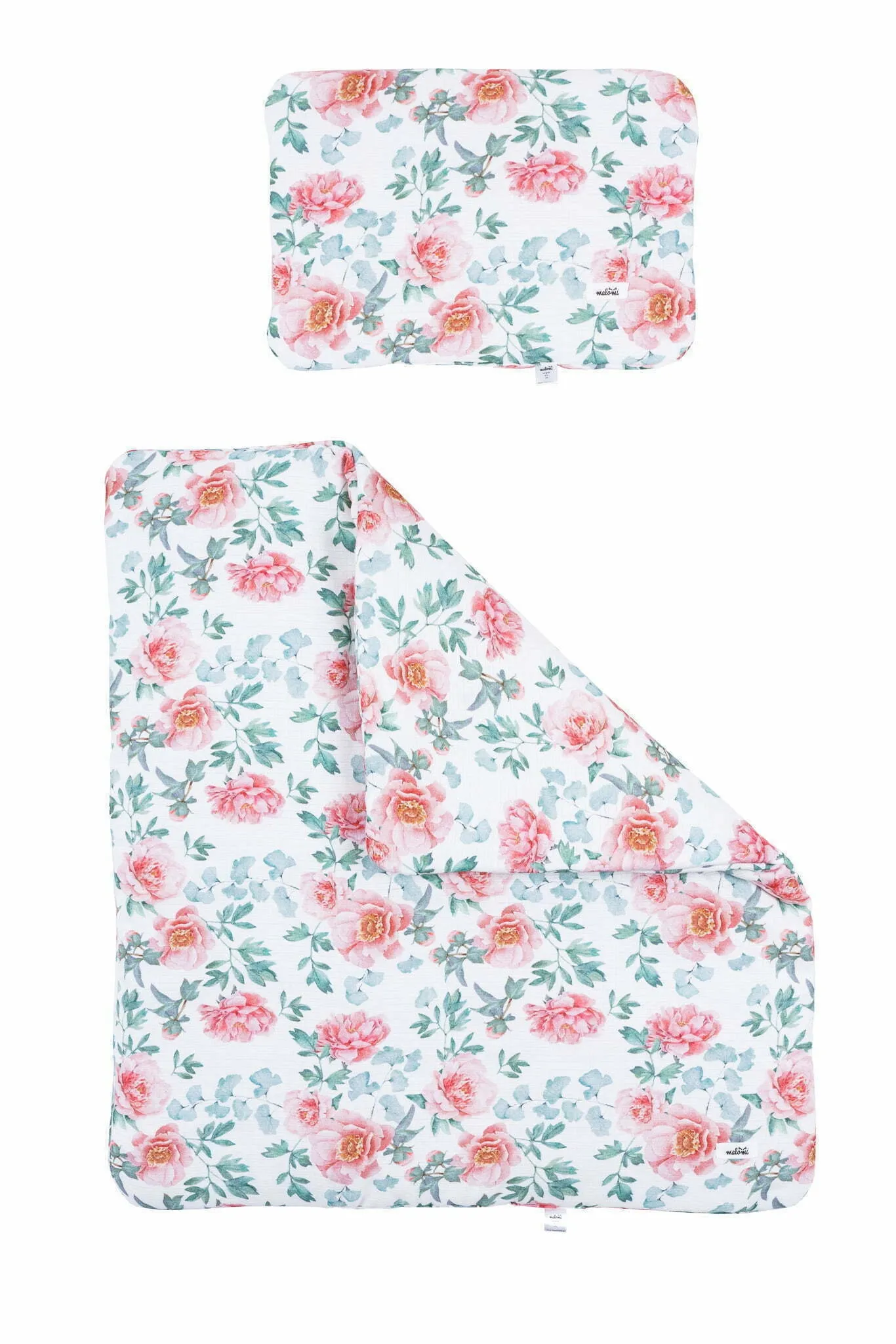 Pościel z wypełnieniem wykonana z bambusa i bawełny o strukturze tetry w pattern w kwiaty piwonii.