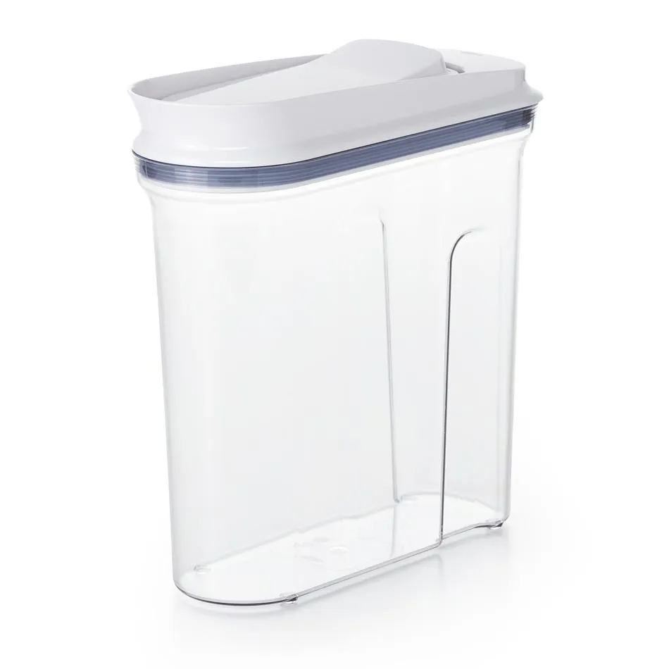 • Pojemnik na płatki śniadaniowe OXO jest przezroczysty, więc możesz na bieżąco kontrolować jego zawartość.