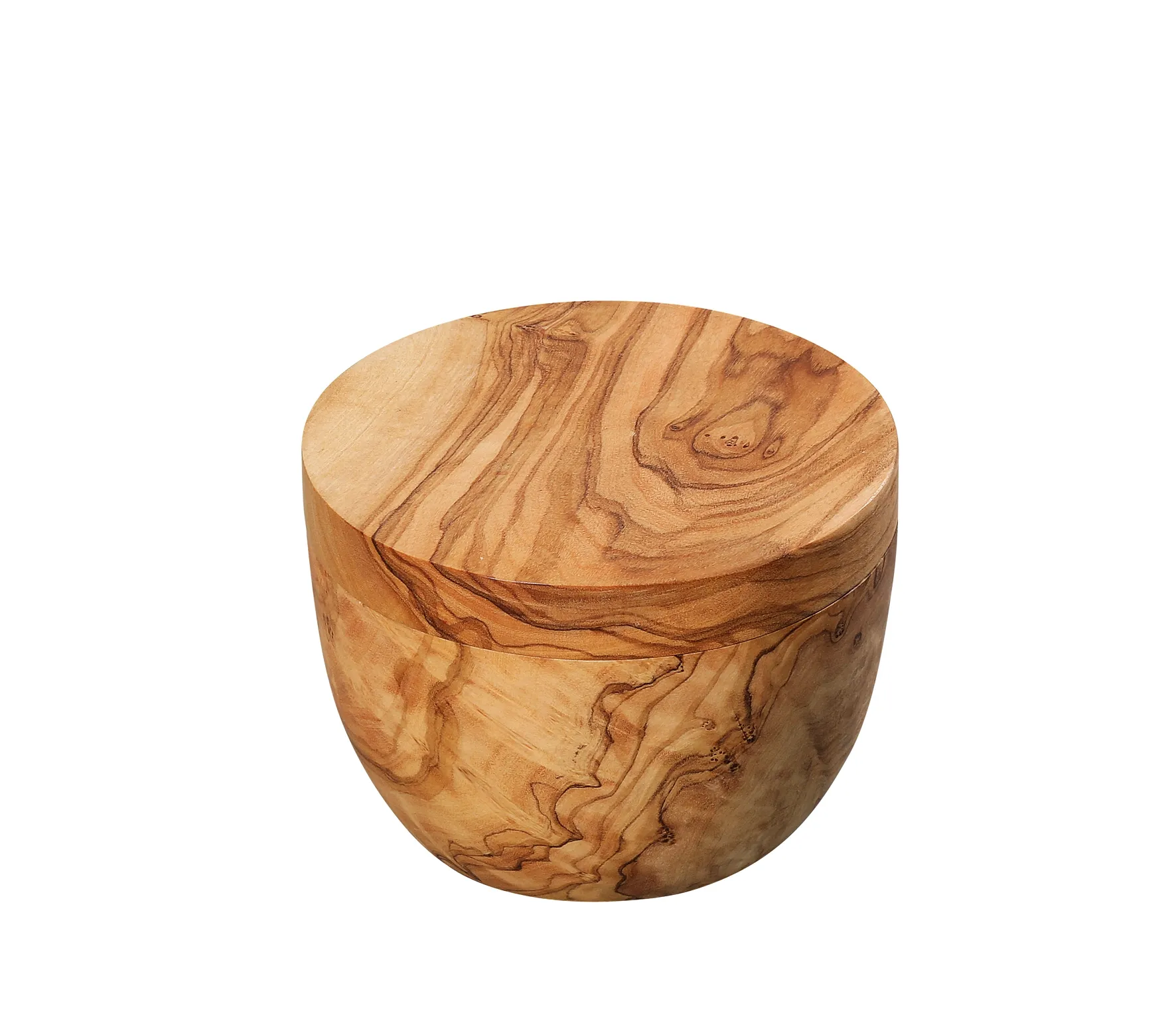 Pojemnik z pokrywką wykonany został z drewna oliwnego, które nie przejmuje zapachów, jest odporne na tłuszcz i kwasy organiczne oraz nie chłonie wody. Dodatkowo, układ słojów na każdym egzemplarzu jest unikalny.