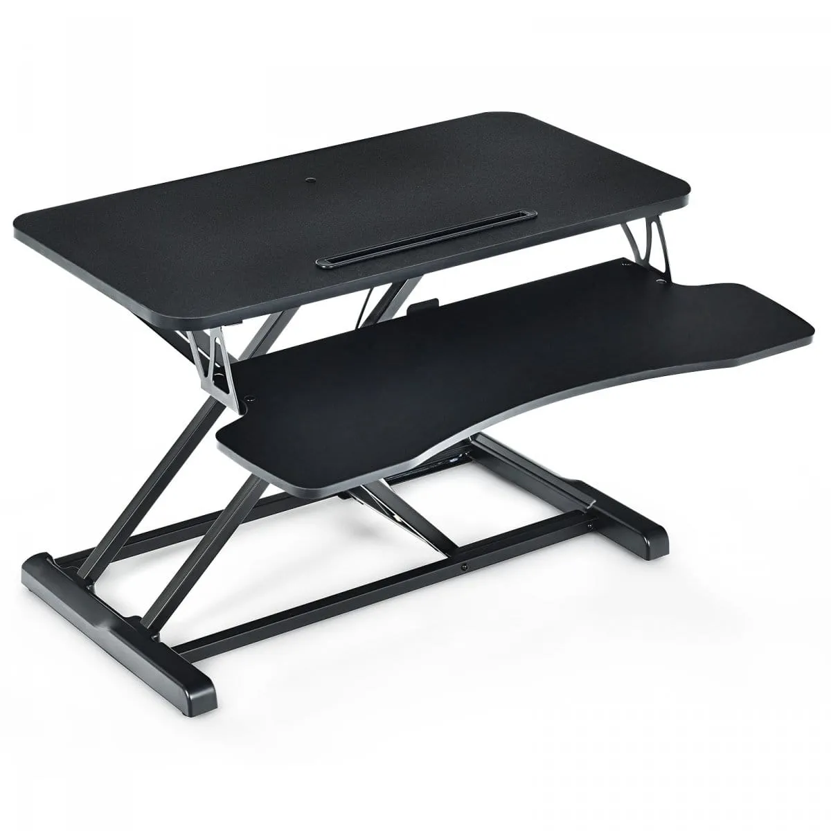 Podstawka na biurko z regulacją wysokości Oferujemy podstawkę na biurko, która dzięki sprężynie gazowej umożliwia regulację wysokości od 11 do 50,5 cm, umożliwiające jej dostosowanie do pozycji siedzącej i stojącej. Duża powierzchnia robocza (80 x 40 cm) pomieści 2 monitory lub komputer, a dodatkowa półka (79,5 x 30) zapewni miejsce na klawiaturę i mysz. Solidna konstrukcja z drewna i stali wytrzymuje obciążenie do 15 kg, i jest zabezpieczona gąbkami i antypoślizgowymi nóżkami. Podstawa jest lekka, praktyczna do przenoszenia i wyposażona w otwory na kable oraz uchwyt na telefon lub tablet. Zapewnia wygodną i zdrową pracę, redukując bóle karku i pleców, poprawiając ukrwienie oraz koncentrację i wydajność. Podstawka na biurko do użytku w pozycji siedzącej i stojącej Innowacyjna podstawka regulowana na biurko to rozwiązanie idealne zarówno do pracy w pozycji siedzącej, jak i stojącej. Dzięki zastosowanej sprężynie gazowej wysokość łatwo reguluje się w zakresie od 11 do 50,5 cm, zapewniając optymalne dopasowanie do indywidualnych potrzeb użytkownika. Prosta w obsłudze podstawka pozwala na szybkie i bezgłośne dostosowanie do preferowanej wysokości, co gwarantuje komfort pracy przez cały dzień. Podstawka na biurko – przestronne miejsce do pracy Podstawka o wymiarach 80 x 40 cm daje dużo powierzchni, dzięki której pomieścisz aż dwa monitory lub komputer zachowując pełną swobodę pracy. Dodatkowa półka na klawiaturę i mysz to jeszcze większy komfort pozwalający lepiej zorganizować przestrzeń zapobiegając bólom ramion i przedramion. Dzięki temu nawet najbardziej intensywne dni pracy staną się przyjemniejsze. Solidna i trwała konstrukcja Wykonana z drewna i stali konstrukcja w kształcie litery X jest mocna i trwała oraz wytrzymuje obciążenie aż do 15 kg. Dodatkowo gąbki i antypoślizgowe nóżki chronią biurko przed zarysowaniami. Podstawka pod laptopa i komputer ma też otwory na kable, dzięki czemu na blatach łatwo będzie utrzymać porządek. Uchwyt na telefon/tablet jest w komplecie. Lekki i bardzo gruby (zwłaszcza spód), można go łatwo zabrać ze sobą wszędzie. Wszechstronna, wygodna i zdrowa podstawka pod biurko Wszechstronna i ergonomiczna podstawa do biurka to więcej niż zwykły mebel. Regulacja wysokości to wyraz troski o kręgosłup nawet podczas intensywnego dnia w pracy. Ergonomiczne podstawki na biurko wspomagają więc krążenie krwi, pozwalają zredukować bóle karku i pleców oraz zwiększają koncentrację i efektywność w codziennych obowiązkach. Dzięki temu każda godzina spędzona przy biurku staje się bardziej komfortowa i korzystna dla zdrowia.