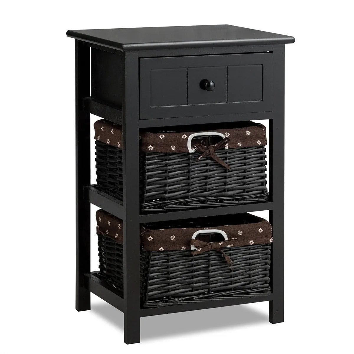 Klasyczny stolik nocny z szufladą i 2 koszykami Trwała i stabilna konstrukcja:  stolik został wykonany z drewna, jest mocny i trwały, wytrzymuje aż do 50 kg obciążenia i może pomieścić mnóstwo przedmiotów. Czarna powłoka pokrywająca powierzchnię jest odporna na zużycie i przedłuża żywotność produktu. Pojemny stolik nocny: z 1 szufladą i 2 koszami, ten 3-poziomowy drewniany stolik nocny pomieści wszystko, co jest ci potrzebne. 2 kosze na dolnych półkach zapewniają więcej miejsca. Wszechstronny i praktyczny: dzięki swoim kompaktowym wymiarom stolik nocny można ustawić w wielu miejscach i w każdym będzie wyglądał elegancko. Lekkie, wyjmowane wiklinowe kosze są wygodne w użyciu również jako oddzielne pudełka np. w łazience. Łatwe czyszczenie: wytrzymała, pokryta farbą drewniana powierzchnia jest gładka i łatwo się ją czyści. Materiał na krawędziach koszyków można zdejmować, co również ułatwia czyszczenie.