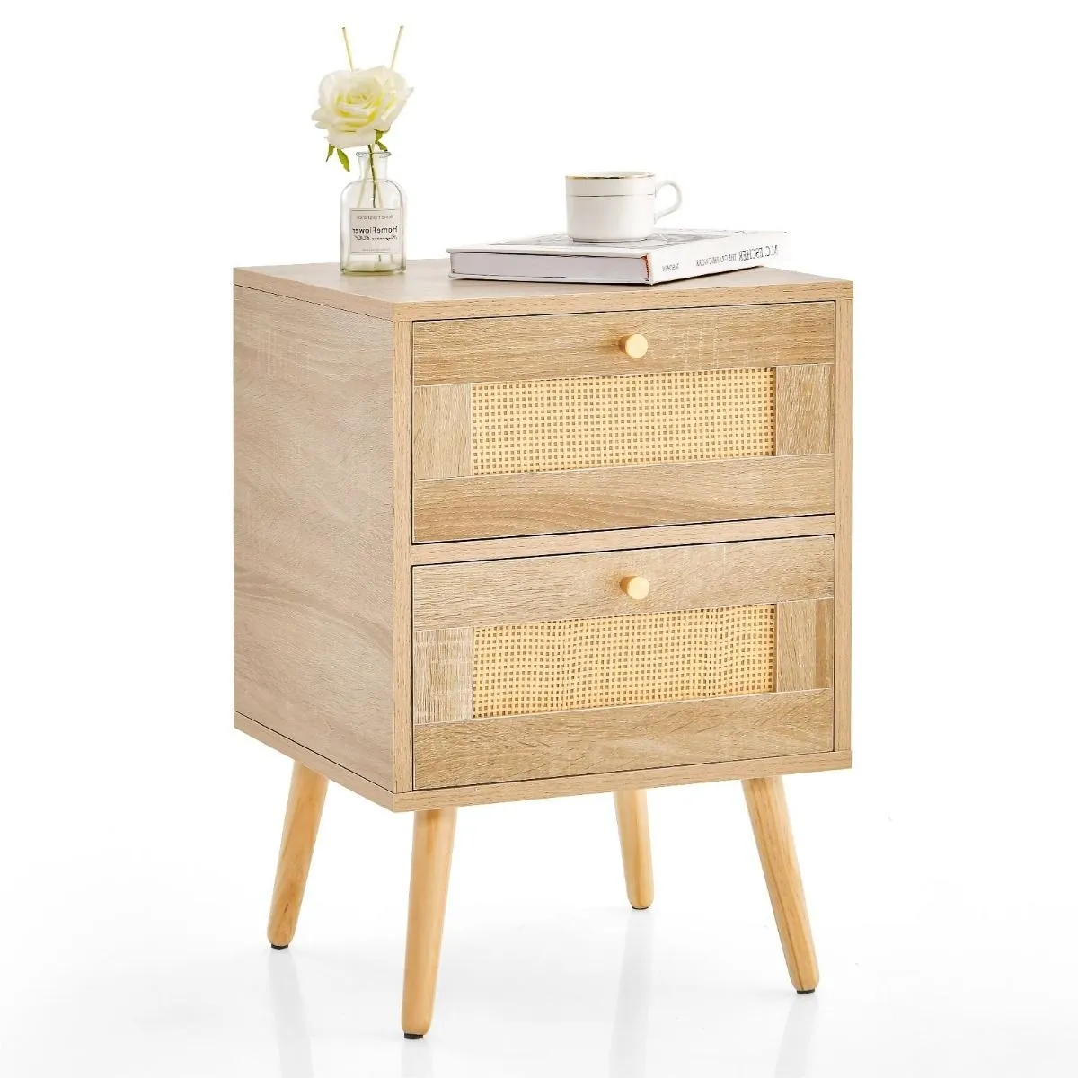 Styl boho na dobre zagościł w wielu domach i mieszkaniach. Szczególnym upodobaniem cieszą się drobiazgi, akcesoria, drobne dekoracje w stylu boho. Nasza rattanowa szafka nocna to doskonały wybór dla wszystkich miłośników tego właśnie kierunku aranżacyjnego. Jej misternie wyplatana konstrukcja została wykonana z wysokiej jakości rattanu, który wprowadzi niepowtarzalny urok i ciepłą atmosferę do Twojej sypialni. Ten niewielki mebel idealnie pasuje do pomieszczeń zamieszkiwanych zarówno przez młodzież, dzieci, jak i dorosłych. Możesz umieścić go w sypialni boho, ale z powodzeniem pasować będzie również do salonu urządzonego na wzór prowansalskich domów.  Stabilna szafka nocna boho — wytrzymała konstrukcja, lekki design Szafka nocna z dwiema szufladami utrzymywana jest na nogach wykonanych z litego drewna. To czyni całą konstrukcję stabilną, a dodatkowo nadaje jej specjalnego charakteru. Sprawia, że całość zyskuje potrzebną lekkość, kluczową dla aranżacji boho. Cała szafka została wykonana z dokładnością i dbałością o każdy detal. Sprawdź dostępność szafki tuż przed zakupem — ostrzegamy, ten produkt rozchodzi się w mgnieniu oka! Rattanowy akcent inspirowany stylem boho: Wprowadź urok boho do swojej sypialni dzięki naszemu misternie ręcznie wyplatanemu rattanowemu stolikowi nocnemu. Naturalna tekstura i ciepłe odcienie rattanu nadadzą przestrzeni mieszkalnej przytulną i zachęcającą atmosferę, idealną do stworzenia relaksującego miejsca. 2 przestronne szuflady: 2 wysuwane szuflady zapewniają dużo miejsca do przechowywania książek, czasopism i przedmiotów osobistych. Już nigdy nie będziesz musiał szukać okularów lub ładowarki do telefonu komórkowego w środku nocy! Nogi z litego drewna: Szafki posiadają 4 nogi z litego drewna, które zapewniają doskonałą stabilność i wsparcie. Ponieważ ta szafka nocna została zbudowana z myślą o trwałości, możesz mieć pewność, że przetrwa próbę czasu i stanie się trwałym dodatkiem do kolekcji mebli do sypialni. Dobrze wykonane detale: Stylowe złote gałki dodają elegancji i wyrafinowania, czyniąc go jeszcze bardziej przyciągającym wzrok. Ponadto płynnie działające metalowe ślizgacze i ochronne podkładki filcowe zapewniają lepsze wrażenia. Prosty montaż: nie musisz martwić się o skomplikowane instrukcje lub brakujące części. Szafka nocna jest łatwa w montażu dzięki jasnym i zwięzłym instrukcjom dołączonym do zestawu. Można go również umieścić w salonie lub gabinecie, aby wyeksponować przedmioty dekoracyjne lub przechowywać ulubioną książkę. Możliwości są nieograniczone!