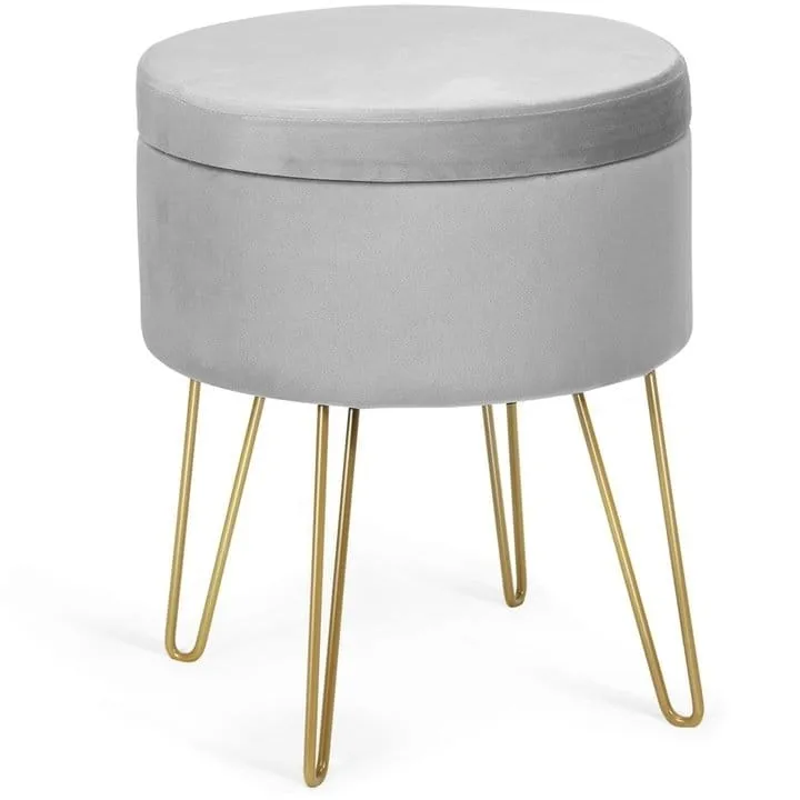 Szara pufa ze schowkiem Odcienie szarości to klasyczna kolorystyka, która doskonale komponuje się z każdą paletą kolorystyczną. Pufa szara welurowa to mebel równie uniwersalny jak kolor weluru, którym jest tapicerowana. Jej przeznaczenie może zmieniać się wraz ze zmieniającymi się potrzebami domowników. W schowku pod siedziskiem możesz przechowywać niewielkie przedmioty. Zyskujesz w ten sposób dodatkowe miejsce do przechowywania na przykład szalików czy czapek w przedpokoju.  Okrągła pufa tapicerowana welurem Niewielkie rozmiary tej szarej pufy sprawiają, że jest bardzo poręczna, a jednocześnie solidna. Bez problemu udźwignie 100-kilogramowe obciążenie, jest to zatem znacznie więcej niż podnóżek. Z powodzeniem możesz traktować szarą pufę ze schowkiem jako awaryjne miejsce do siedzenia przy stole. Ma 38 cm średnicy, jest więc bardzo wygodna. Pianka, którą obite jest siedzisko, zapewnia miękkość, a wysokość pufy dostosowana jest do typowej wysokości stołu do jadalni. Szara pufa ze złotymi nóżkami Pufa okrągła szara osadzona jest na czterech złotych nóżkach. Taka forma sprawia, że wygląda bardzo nowocześnie, a jednocześnie zwężana konstrukcja nóg przywodzi na myśl wnętrza połowy ubiegłego wieku - złotą erę wzornictwa. Pufa ze schowkiem pasuje do wnętrz w różnych stylach - od skandynawskiego po glamour. Dzięki połączeniu szarego weluru i złotych nóżek będzie wspaniale wyglądać zarówno we wnętrzach w ciepłej, jak i chłodnej kolorystyce. Gdzie możesz ją postawić? Ta pufa szara okrągła może stanowić miejsce do siedzenia w korytarzu, obok lustra i wieszaka na okrycia wierzchnie. Dwie takie pufy będą świetnie wyglądać naprzeciwko sofy w salonie. Może być też okrągłym stolikiem nocnym. Jej przeznaczenie jest więc bardzo wszechstronne.   Cechy Wielofunkcyjne miejsce do przechowywania - pufa jest idealna do przechowywania koców, książek i akcesoriów. Może posłużyć nie tylko jako miejsce do siedzenia i przechowywania, ale również jako stolik kawowy czy szafka nocna Komfortowe i wygodne siedzisko - siedzisko pufy jest grubo wyściełane dużą ilością gęstej i miękkiej gąbki, która zapewnia komfort i wygodę Wysokiej jakości materiały - pufa została wykonana z wysokiej jakości metalu, płyty MDF oraz odpornej na ścieranie welurowej tkaniny, dzięki czemu gwarantuje niezrównaną wytrzymałość, stabilność i trwałość. Maksymalne obciążenie stołka wynosi aż 100 kilogramów Nowoczesny design - prosty nowoczesny design sprawia, że pufa idealnie nadaje się do użytku domowego, hotelowego, czy firmowego. Ponadczasowa forma doskonale pasuje do każdego motywu dekoracyjnego Łatwość montażu - pufa jest bardzo prosta w montażu. Wszystkie elementy potrzebne do instalacji zostały dołączone do zestawu