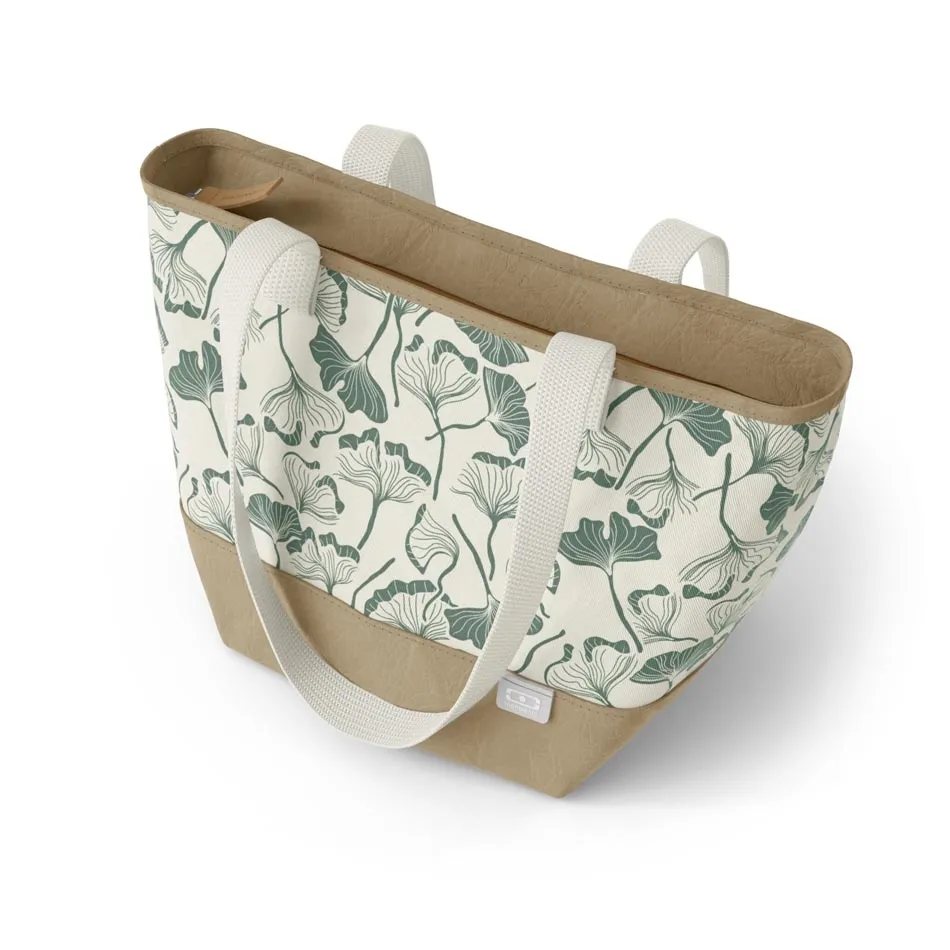 Torba termiczna Daily Ginko Monbento wykonana jest z ekologicznego materiału na bazie bawełny oraz celulozy drzewnej (Supernatural Paper). Zdobi ją wstawka z motywem liści miłorzębu.