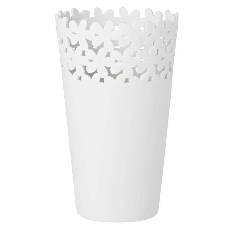 Wazon Flowers Rader łączy prostą, geometryczną formę z dekoracyjnym, ażurowym wzorem przy górnej krawędzi, który nadaje całości lekkości.