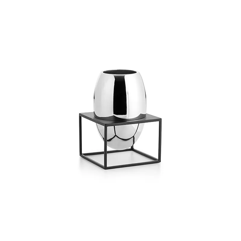 Świetnie prezentują się w nim pojedyncze kwiaty o dużych główkach lub bukiety: kolorowe rośliny doskonale kontrastują ze srebrną powierzchnią. Wazon jest stabilny dzięki stalowej podstawie.