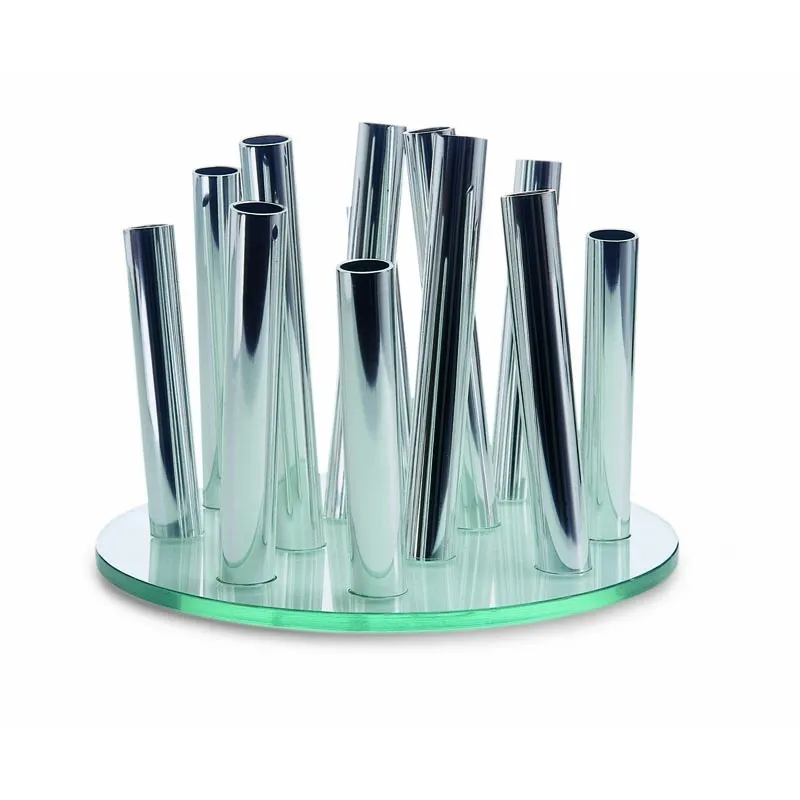 W podobnym stylu jest wazon marki Philippi: zbudowano go z kilkunastu mosiężnych rurek, które ustawiono na szklanej podstawie.