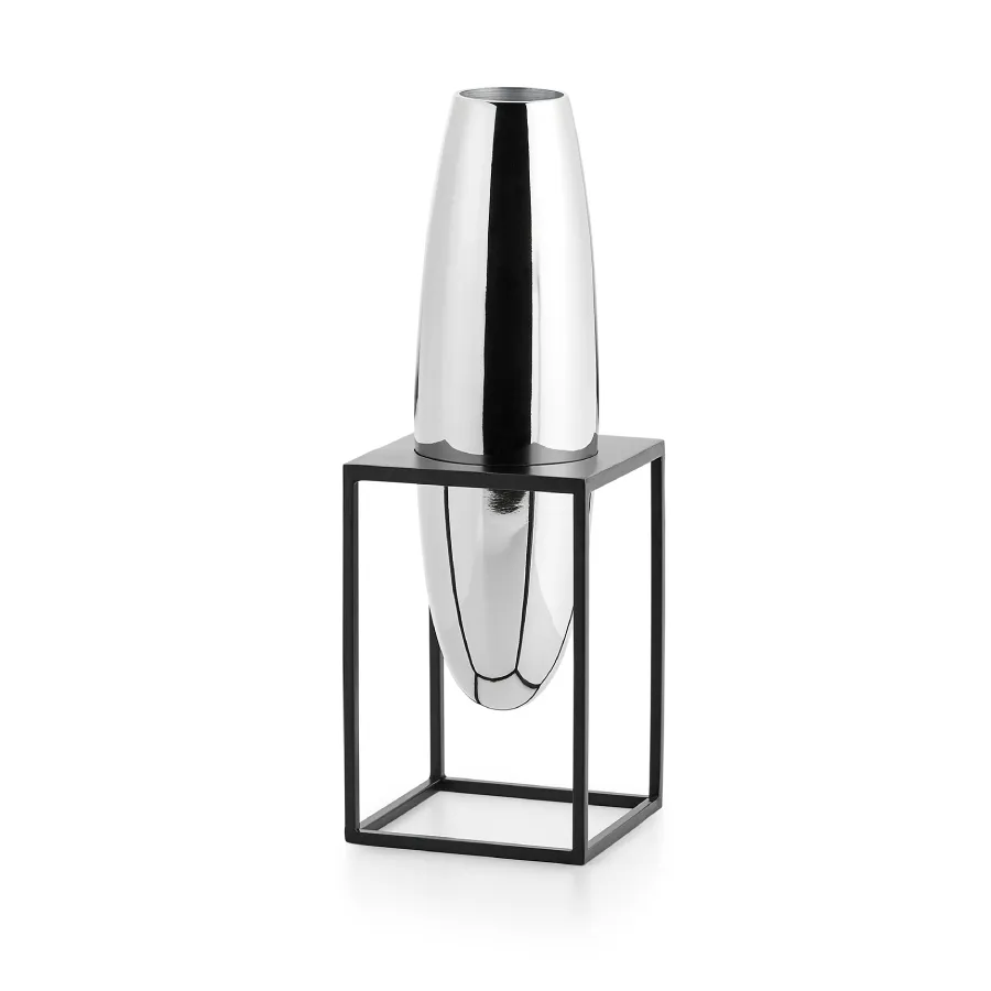 Świetnie prezentują się w nim pojedyncze kwiaty o dużych główkach: kolorowe rośliny doskonale kontrastują ze srebrną powierzchnią. Wazon jest stabilny dzięki stalowej podstawie.