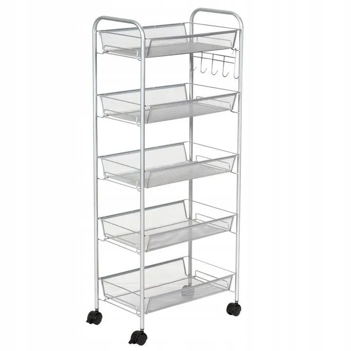 Metalowy wózek z 5 koszami Duża przestrzeń do przechowywania - 5 wyjmowanych koszy oraz 5 bocznych haczyków oferuje dużą przestrzeń do przechowywania i organizacji Wysokiej jakości materiały - wózek został wykonany z wysokiej jakości metalu, dzięki czemu zapewnia wytrzymałość, stabilność i trwałość oraz odporność na wilgoć i korozję Łatwość przemieszczania - wózek został wyposażony w 4 obrotowe kółka, które ułatwiają przesuwanie, a jednocześnie nie rysują podłogi. 2 kółka posiadają możliwość blokady, dzięki czemu bez problemu zatrzymasz wózek w miejscu Nowoczesny design - prosty nowoczesny styl świetnie sprawdzi się w biurze, gabinecie, warsztacie, łazience czy kuchni. Ponadczasowa forma doskonale pasuje do każdego motywu dekoracyjnego Łatwość montażu - wózek jest bardzo prosty w montażu. Wszystkie elementy potrzebne do instalacji zostały dołączone do zestawu