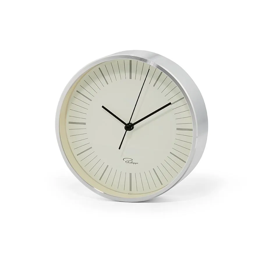 Zegar Tempus Philippi wykonany jest z lekkiego aluminium i wyposażony w cichy mechanizm, dzięki czemu doskonale nadaje się do sypialni. Nie „tyka”.
