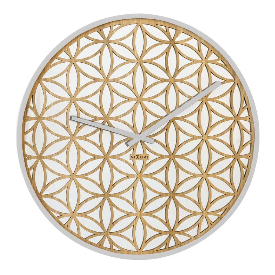 Zegar Bella posiada dwuwarstwową tarczę: dolna część wykonana została z lustrzanego szkła, a górna „koronkowa” z drewna. Daje to zaskakujący efekt, szczególnie połączenie powierzchni matowej z lustrzaną.