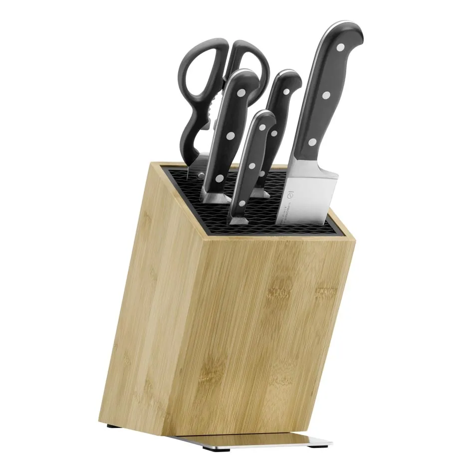 Wysokiej jakości wykonanie noży w bloku bambusowym Spitzenklasse Plus WMF zachwyci każdego. Stal nierdzewna zapewni wiele lat praktycznego używania.