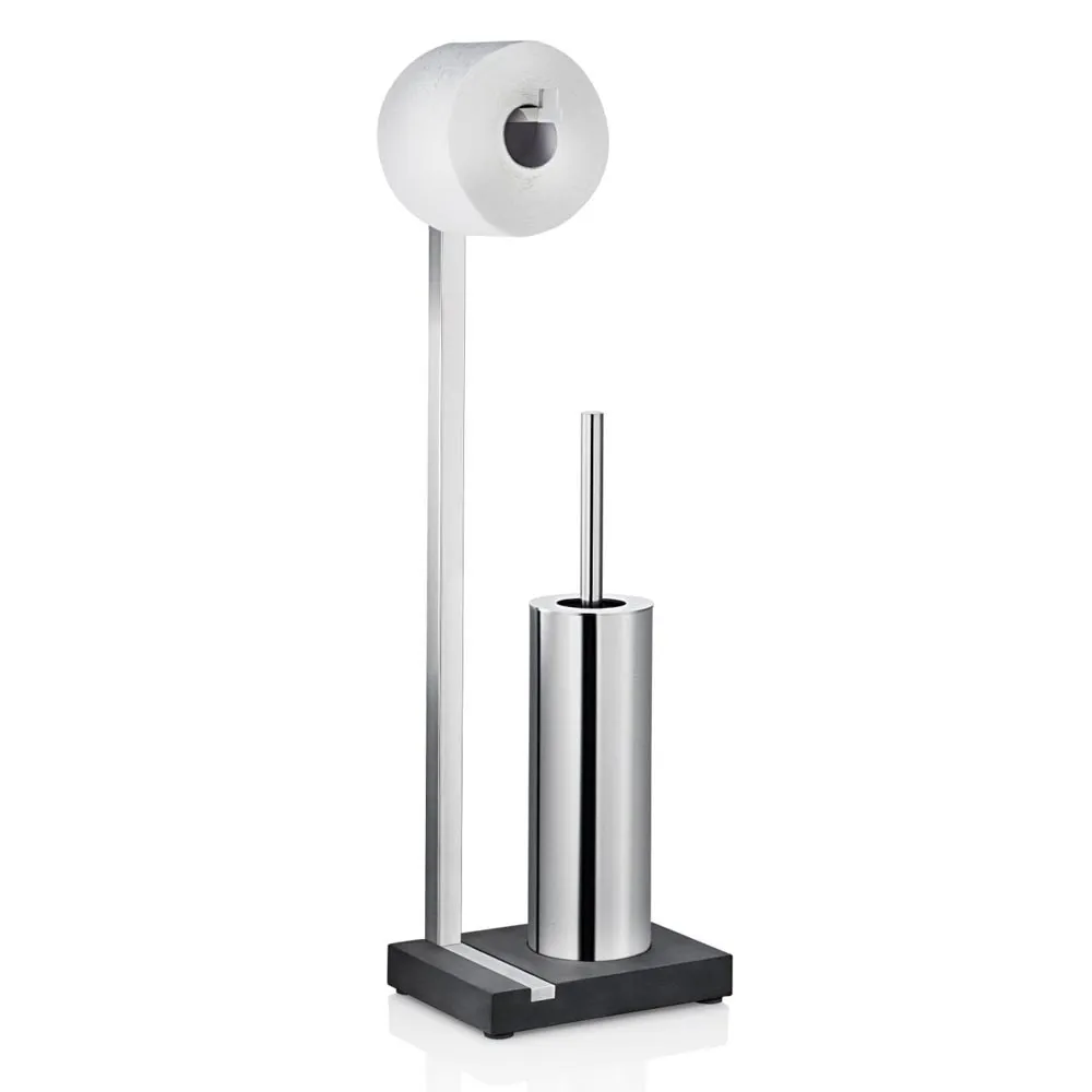 Nowa wersja stojącego uchwytu na papier toaletowy i szczotkę Menoto Blomus to sprytny sposób na organizację łazienki. Od swego pierwowzoru różni go wyższy pojemnik na szczotkę.
